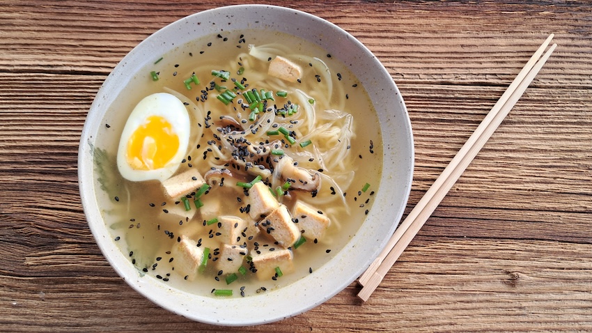 Per servire, distribuire in ogni ciotola il brodo con i noodles, aggiungere i cubetti di tofu e mezzo uovo. Completare con semi di sesamo nero ed erba cipollina tritata.