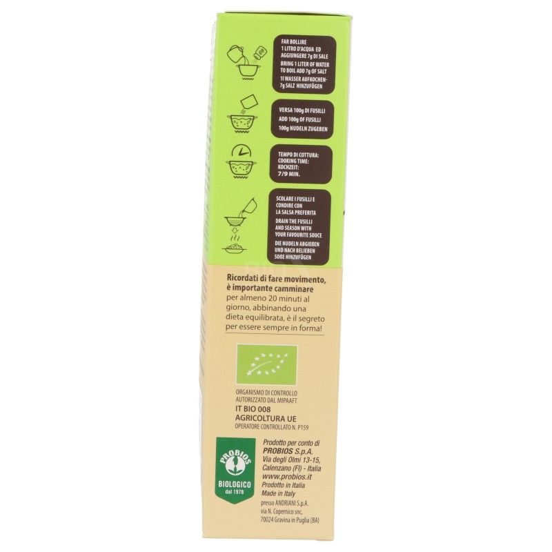 Uso: Far bollire un litro d'acqua con 7 g di sale, versare 100 grammi di prodotto e cuocere per 7/9 minuti, scolare e condire a piacere.