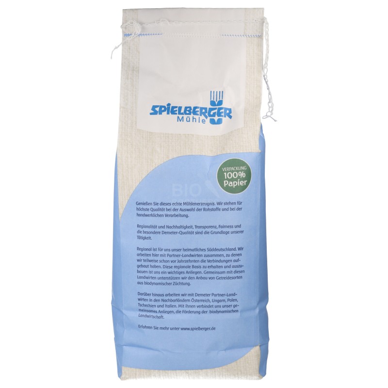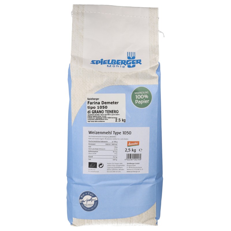 La farina di grano tenero 1050 Spielberger è una farina semintegrale prodotta secondo i valori biodinamici. Molto versatile, da avere sempre in dispensa per tutte le preparazioni, pane , pasta ,pizza e dolci; da usare da sola o in combinazione con altre farine. Ideale da utilizzare con la pasta madre ma ottima anche con il tradizionale lievito di birra per ottenere pani soffici e fragranti.