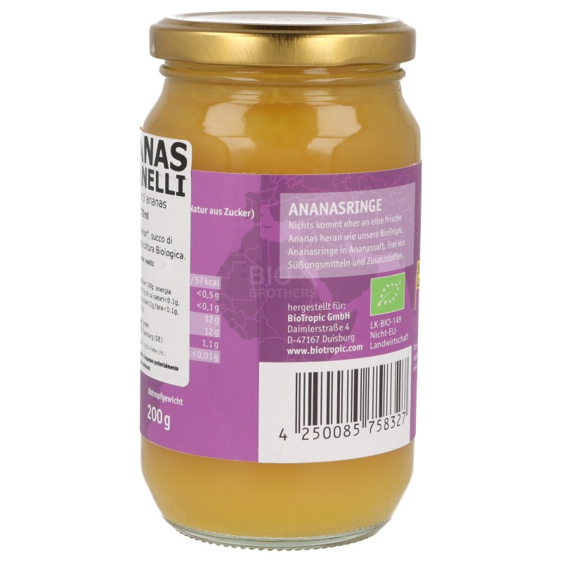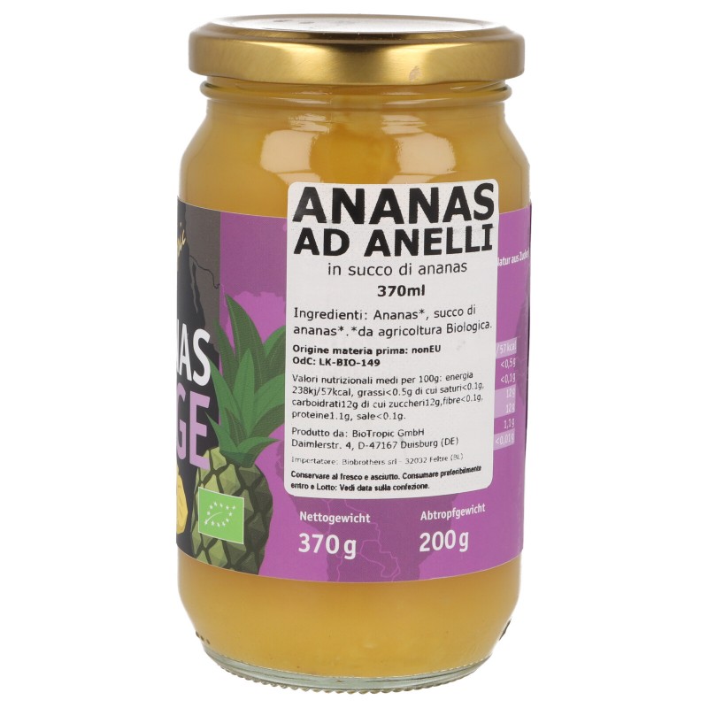 Anelli di ananas maturo biologico conservati in succo 100% di ananas. Non ha dolcificanti aggiunti, ha la sola dolcezza della frutta. Dolce e saporito l'ananas si utilizza nei dolci oppure per fare la pizza hawaii.