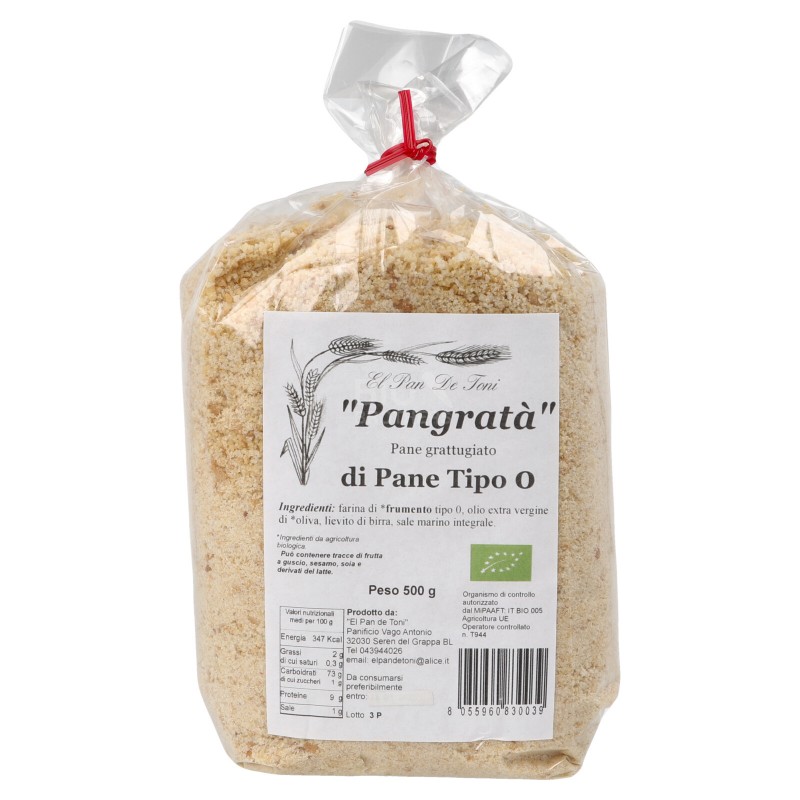 Pane grattugiato biologico tipo 0 ideale per cucinare. Il "Pangratà" El Pan de Toni è saporito e delicato e viene prodotto a partire da pane bianco biologico tipo 0 cotto in moderni forni a legna. Dopo la seconda cottura viene macinato a e confezionato in modo artigianale. Si presta per panare, asciugare ripieni o fare polpette.