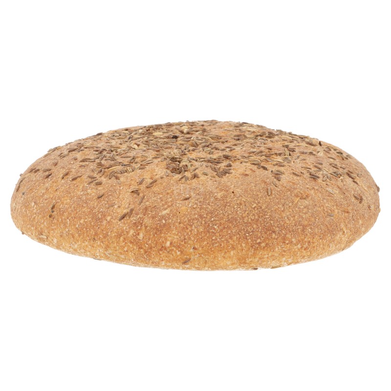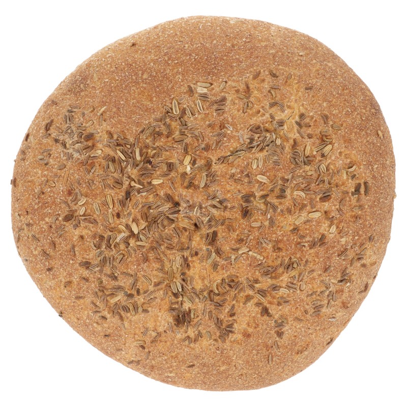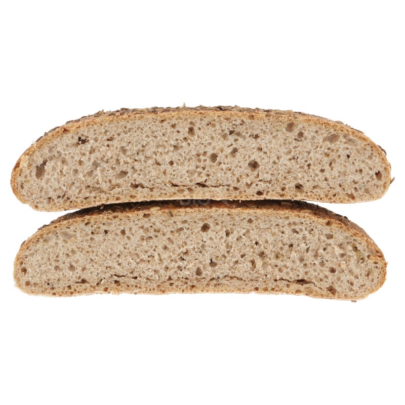 Ingredienti: farina integrale di frumento*, farina integrale di segale*30%, acqua, lievito naturale (farina di frumeno*, acqua), sale marino integrale, semi di finocchio*, semi di cumino*.