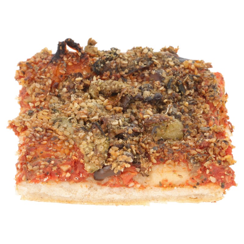Ingredienti farcitura: verdura in proporzione variabile*(zucchine*, peperoni*,melanzane*, carciofi*), pomodoro*, olio extra vergine di oliva*, olive denocciolate*, funghi shii-take*, capperi*, semi di sesamo*, sale marino integrale, aglio*, origano*, basilico*, peperoncino*.