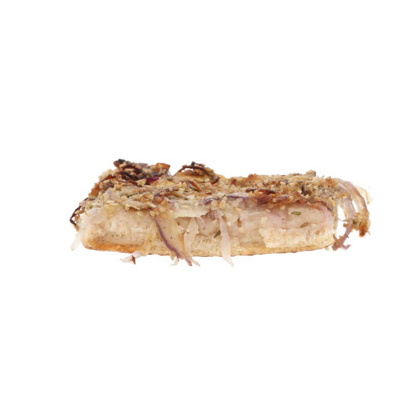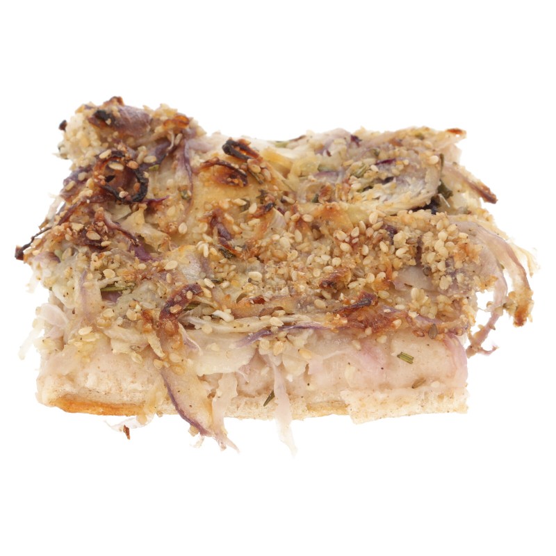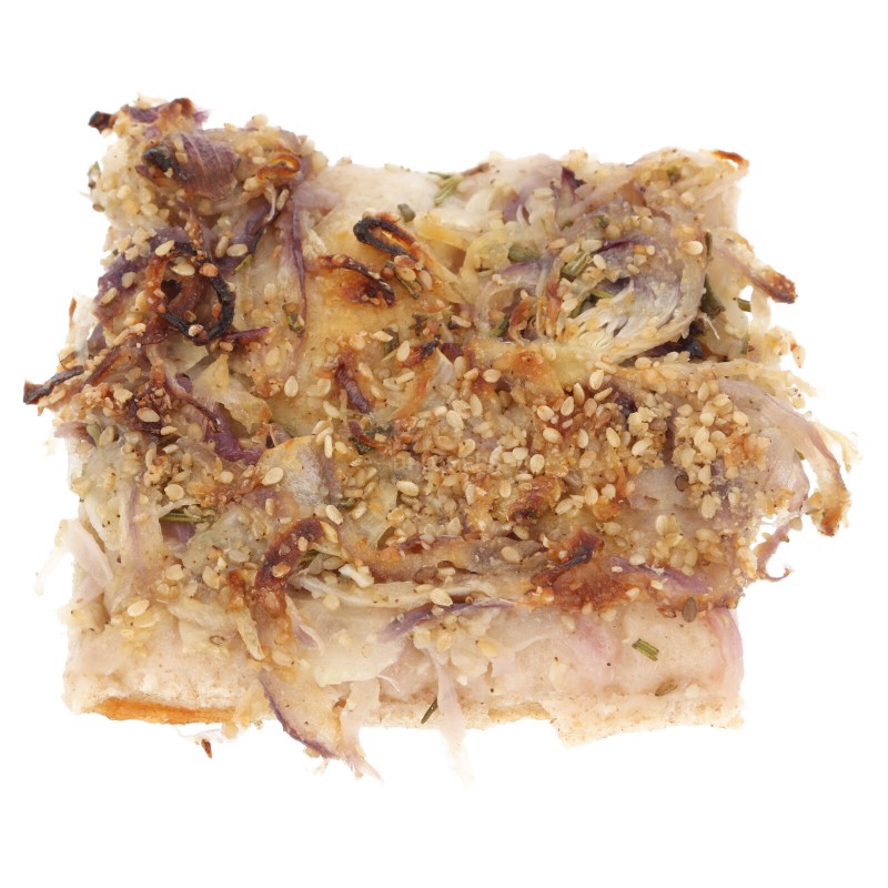 Ingredienti farcitura: cipolla*, olio extra vergine di oliva*, semi di sesamo*, sale marino integrale, rosmarino*, peperoncino*.