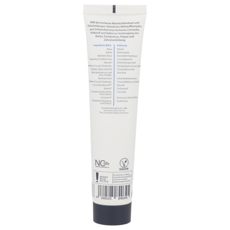 Dentifricio bio vegano senza fluoro aggiunto, i principi attivi del cumino nero (nigella) , della curcuma e dello xylitolo aiutano a prevenire le infiammazioni della mucosa del cavo orale e proteggono dalla formazione di placca e carie.